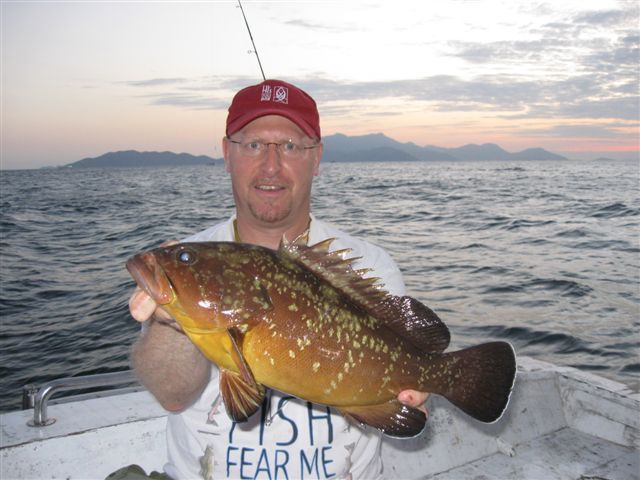 We were fishing on the “Master Craft,” a comfortable dive boat. Not the fastest, but stable and a very nice fishing platform, under the command of Captain Guilherme Studart and able deckhand Leandro. We worked out way out into the bay, trying islands, rockpiles, channels, and finally ending up at the entrance to the bay, just across from from the beautiful Isla Grande. A species here, a species there, mixed in with plenty of stuff I had caught before, but some lovely fish and a couple of nice groupers in the mix. The new ones before dark –