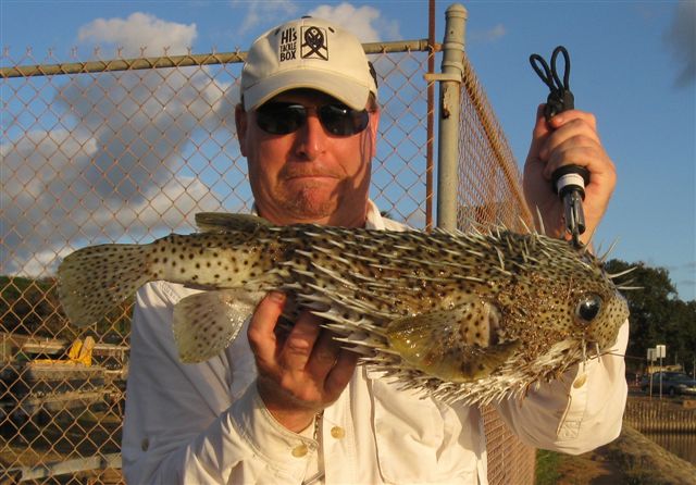 A bit later, we spotted a snowflake moray under a rock slab. I was dabbling the bait near the rock opening, completely focused on watching for the eel’s head to reappear, when I was startled by a huge shape coming into my field of view. It was a porcupinefish – the kind of spiny puffer most often sold in souvenir stands, all blown up into an undignified fish mummy. And it was a big one. I swung the bait over toward him and let it sink. He turned away, then caught the scent and made a gentle turn and fluttered down onto the squid. I set the hook, and he took off like Tiger Woods after a bargain stripper. Twice he had me wrapped around a piling, and twice I yanked him back. This went on for a while, but I finally began gaining line.
