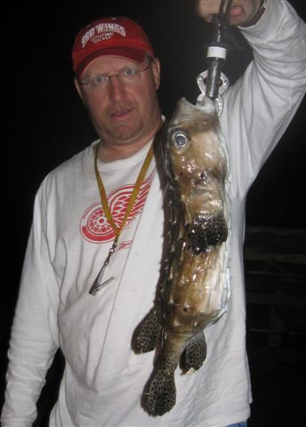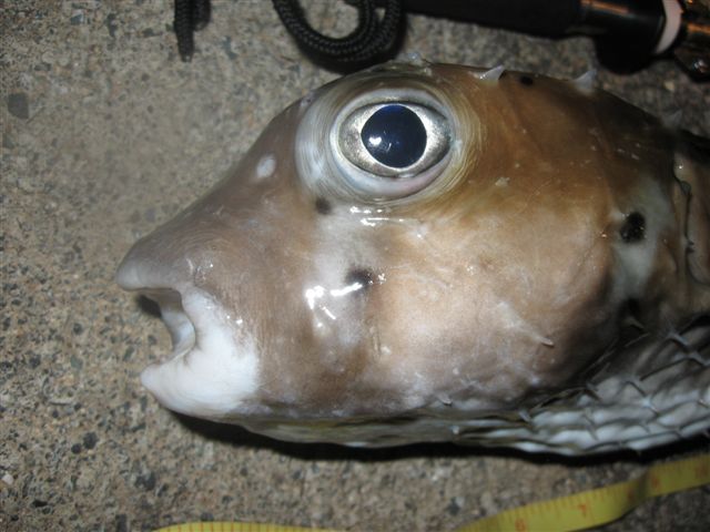 After a dinner at Pizza Bob’s we headed back to the harbor for another shot at an eel. They were a bit scarce – we got another small undulated moray, and just as I was getting ready to leave, Jaime spotted another good-sized porcupinefish nosing around the rocks. What the heck, I figured. Gently nudging Jaime out of the way, I cast to it. It eased over to the squid and pounced, but unlike the fish from last night, it just sort of wallowed there until I grabbed it with a Boga Grip. As I started to get the hook out, it became apparent that this was not the same species – shorter spines, different color pattern. It turned out to be a Spotted Burrfish of some 4 pounds, not a record but certainly a new species.
