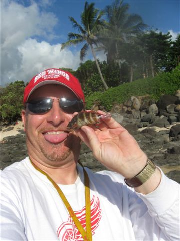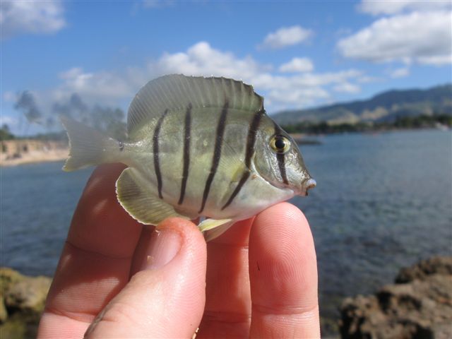 And so it was off to the north shore. And again, it was not going well for me. We fished a rocky point that tends to have a variety of tropical critters, but I burned through an entire bag of bait catching nothing but saddle wrasses and the occasional damselfish. I had actually run out of bait and was just fishing a bare tiny jig when I got another slight tug. Setting the hook and yanking the surprised fish out of the water, I had started to release what I thought was another sergeant, but I did a quick doubletake and it slowly dawned on my discouraged mind that this was no sergeant. Unbelievably, I held in my hand a Convict Tang, a beautiful and completely vegetarian fish that is almost never caught on hook and line. “Oh, how I love fishing!” I called out. Life was good. For a brief, shining moment, it was just me and the beautiful Hawaiian shoreline and a new fish and Jaime seemed far, far away. Don Ho stopped singing in my head. I released the fish after some photos and he swam away in a burst of tiny bubbles.