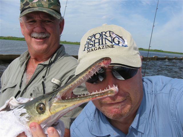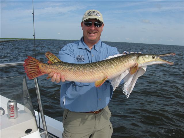 Speaking of fish laughing at me, on my next cast, I felt a bite, set the hook, and thought I had snagged the wall – but then I noticed it was moving. I reeled up as fast as I could, and a 4 foot alligator gar launched up out of the water and spit the hook.  Ah, the alligator gar – a design that works so well it hasn’t changed in millions of years. Primordial and frightening, these things grow to hundreds of pounds and have apocryphal sins attributed to them, such as carrying off children, sheep, and virgins. (See “Gobius draculus” in “The Compleat Angler” episode from July –http://2000fish.com/2010/07/18/countdown-to-1000-the-compleat-angler/ )  The one I lost was more like 25 pounds, but I just had to land one, so I rigged up a wire leader and strip bait and let it drift in the current. About 20 minutes later, the rod went down, gently at first, then building into a line-peeling run down the wall. It jumped twice like a tarpon, but the really exciting part was netting it. These things have teeth and very poor social skills. I took the courageous path and sold out the guide – “Jim, you’re on your own.” He scooped it up without incident.