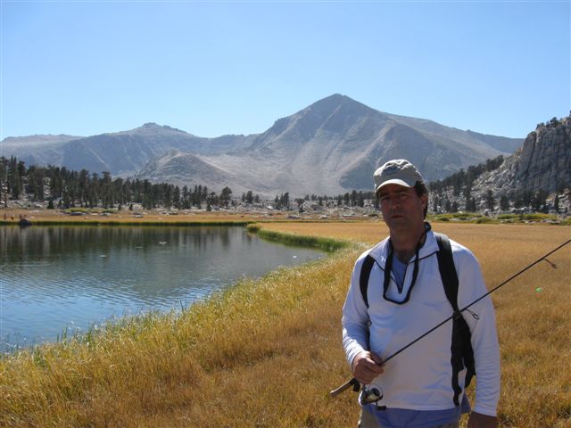 Mark pointed out where he had caught the fish, and as soon as we had released the critter, I turned around and began casting the fly/bubble combo. I got a few more taps, and just when I was getting ready to change to a spinner, I got a hookup. For a fish that was (generously) 8 inches, it put up a spirited fight, but I got it to the shallows and then survived that breathless moment of swinging it onto the bank. At last, a golden trout, with a huge assist from Spellman. The pictures don’t really do justice to how beautiful the fish really was, especially with the high mountain scenery and clear, fresh, thin air. It positively glowed, and Mark and I traded manly high fives and whoops of celebration in the meadow, with appropriate pauses to catch our breath.