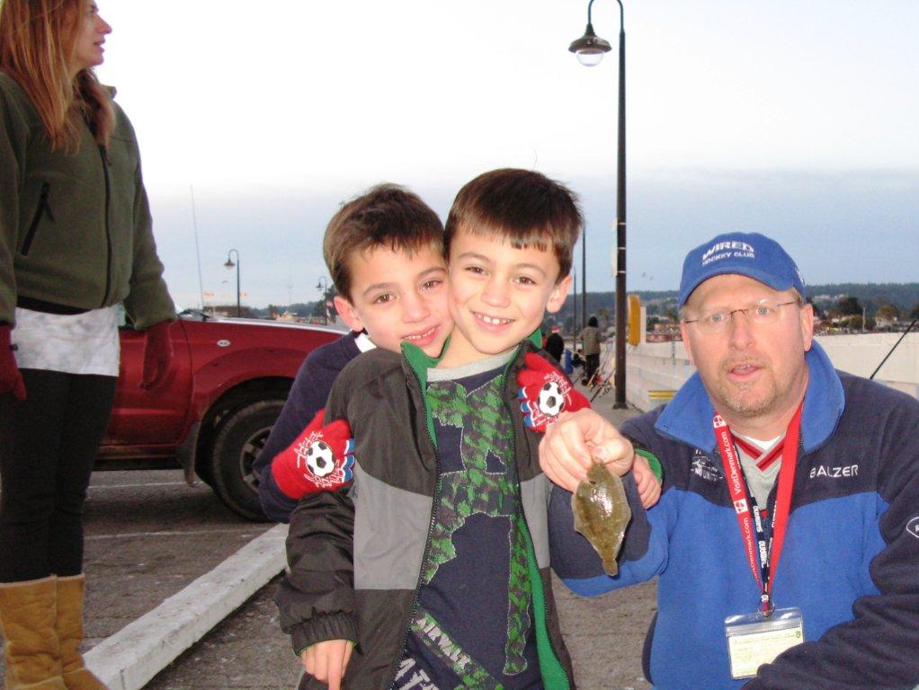 Cohlton and Aiden Mendoza a very small sand dab at Santa Cruz pier, 11/26/10. Note Marta vigilantly watching the rods.