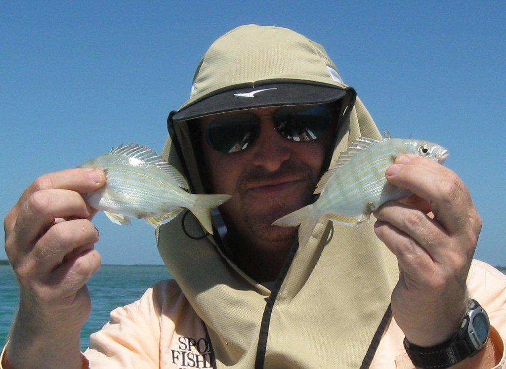As long as I have been going to the Keys, I have been fishing with Vinnie. He is one of the premier flats guides in the area, and has put countless clients into countless bonefish, permit, tarpon, and snook. Like any expert, he is focused on the glamour species, which is why fishing with me must clearly be retribution for something he did wrong in a past life. He knew there was something terribly wrong with me from our first trip together in August of 1999, but he has stuck it out and it has become a personal challenge for him to find some new and bizarre fish every time I show up. Apart from my first tarpon and bonefish, this has also led to unlikely triumphs like the Redfin Needlefish, the Porkfish, and of course the Dwarf Sand Perch.