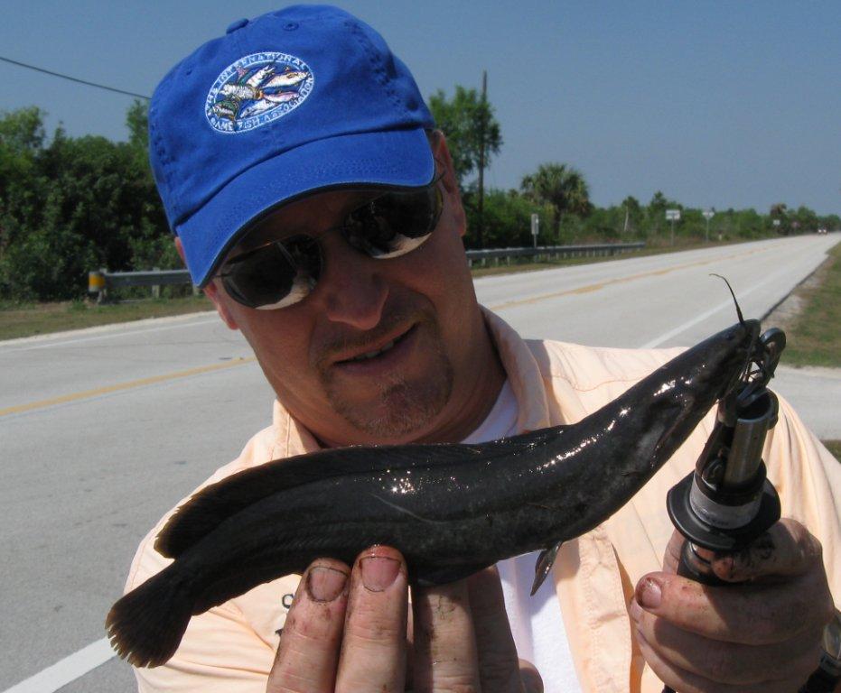 We tried a couple of other spots, but all the Walking Catfish had apparently walked. As it got toward noon, we made one more stop to pursue the now-elusive creature. Again, they popped up all over the place, reenacting their bizarre fisherman-mocking ritual, and after I caught a few bullheads, I was ready to give up. (All the while keeping an eye out for alligators.) But Marty stayed on me, and after another bullhead or two, I got a solid bite and lifted a surprised Walking Catfish out of the water and onto the grass, where it, (you guessed it), tried to walk away. I snatched it up and got a couple of photos – that made 5 new entries in one morning, which is about as good as it gets.