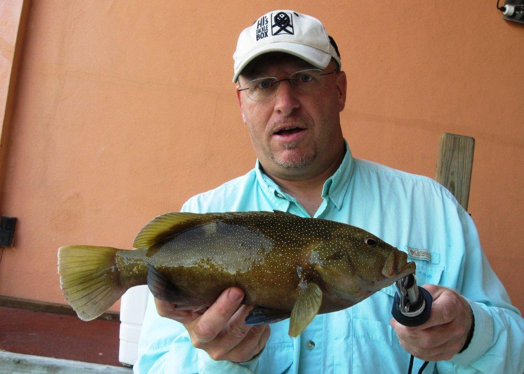 Marty moved the boat again, this time several miles north. We put the lures back out, and at least the Blue Runners didn’t find us. We had trolled for about 20 minutes, with Marty clearly annoyed that the Ceros were missing, when the right side rod went down. Ahhhh, I thought – the Blue Runners were back. Or were they? I hoped it wasn’t a Blue Runner, but I also prayed it wasn’t another one of those large Oscars. (Granted, this would be difficult in saltwater.) It was actually quite a surprise catch – an especially ambitious Coney Grouper had come up off the bottom and taken the lure. Go figure.