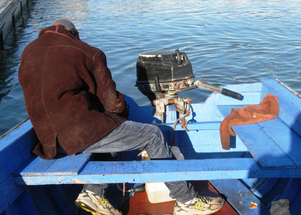 While we waited, I did fish under the dock and get a few gobies, but alas, these were the same species I had caught in Turkey last year. (See http://2000fish.com/2011/01/01/venus-visits-the-temple-of-diana-mars-goes-fishing/) Once the boat finally appeared, we then had to wait for the motor. My patience was growing as thin as my hair. When the boatman finally got the outboard and bolted it to the stern, my mouth dropped in astonishment. I had seen this engine laying on the dock when I showed up, and I had presumed it was a discarded pre-war relic that had corroded onto the planking. More duct tape than metal, it took over an hour to get started. Once it did start, it sounded like an asthmatic 6 year-old going “phhhhhhhhht,”  so that even at full throttle, we could easily whisper over it.