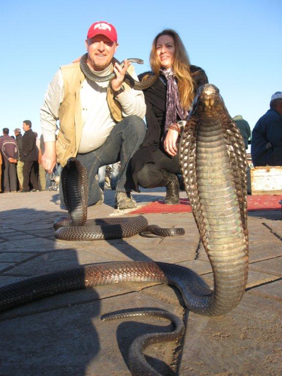 My companion and I hang out with local serpents in Marrakesh. (Yes, we got there on the express.) In case you wondered, yes, those are cobras on the pavement – the snake around my neck was apparently not a cobra, which is nice.