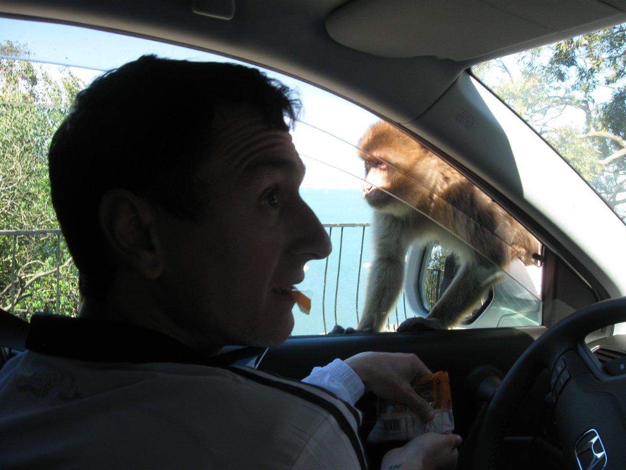 The same monkey stares me down. He had just used me as a springboard to jump from a van onto our car, which scared the heck out of me but amused the other tourists.